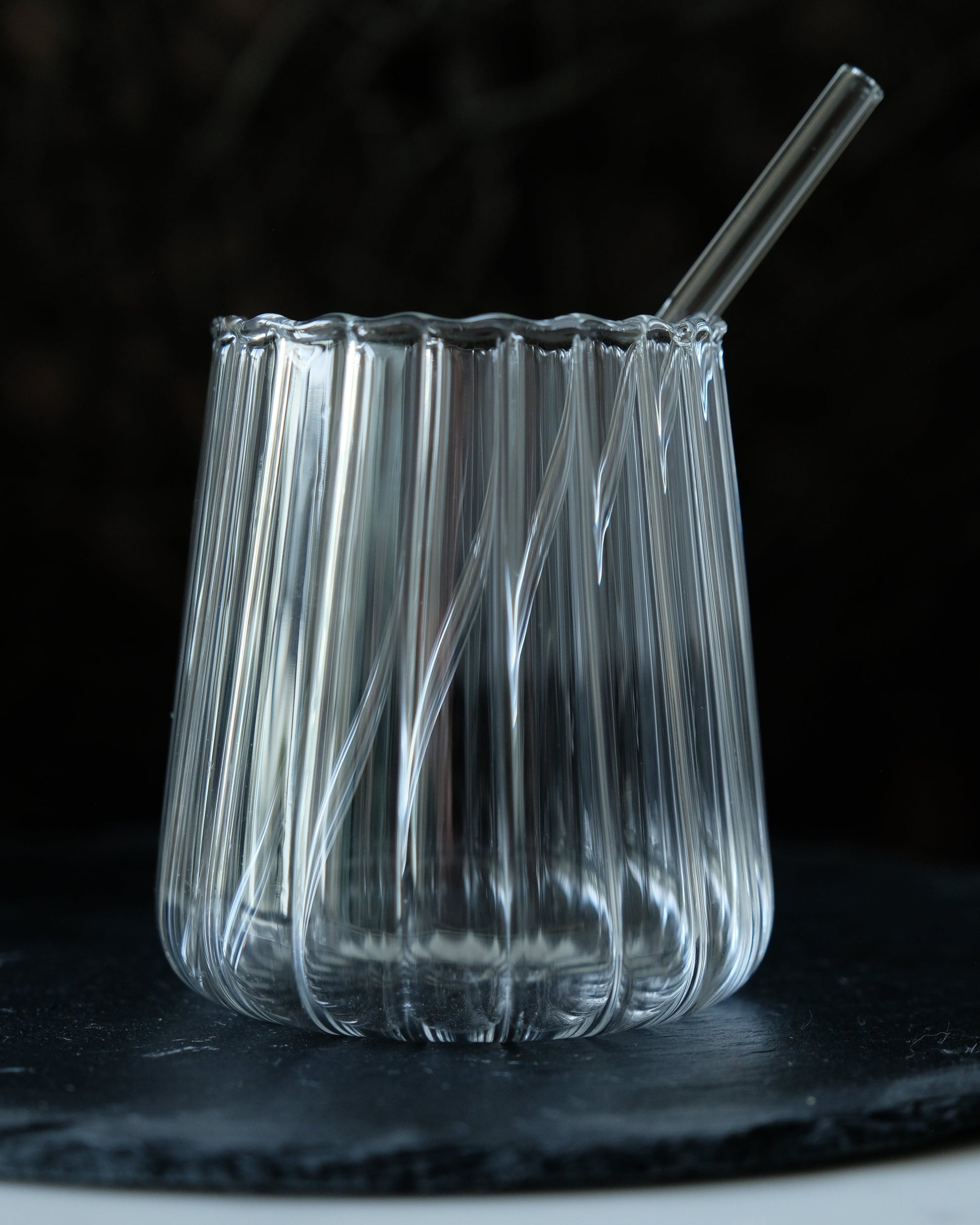 Elevate your drinking experience with this sleek glass tumbler, featuring a sophisticated ridged design that adds a touch of texture and style.