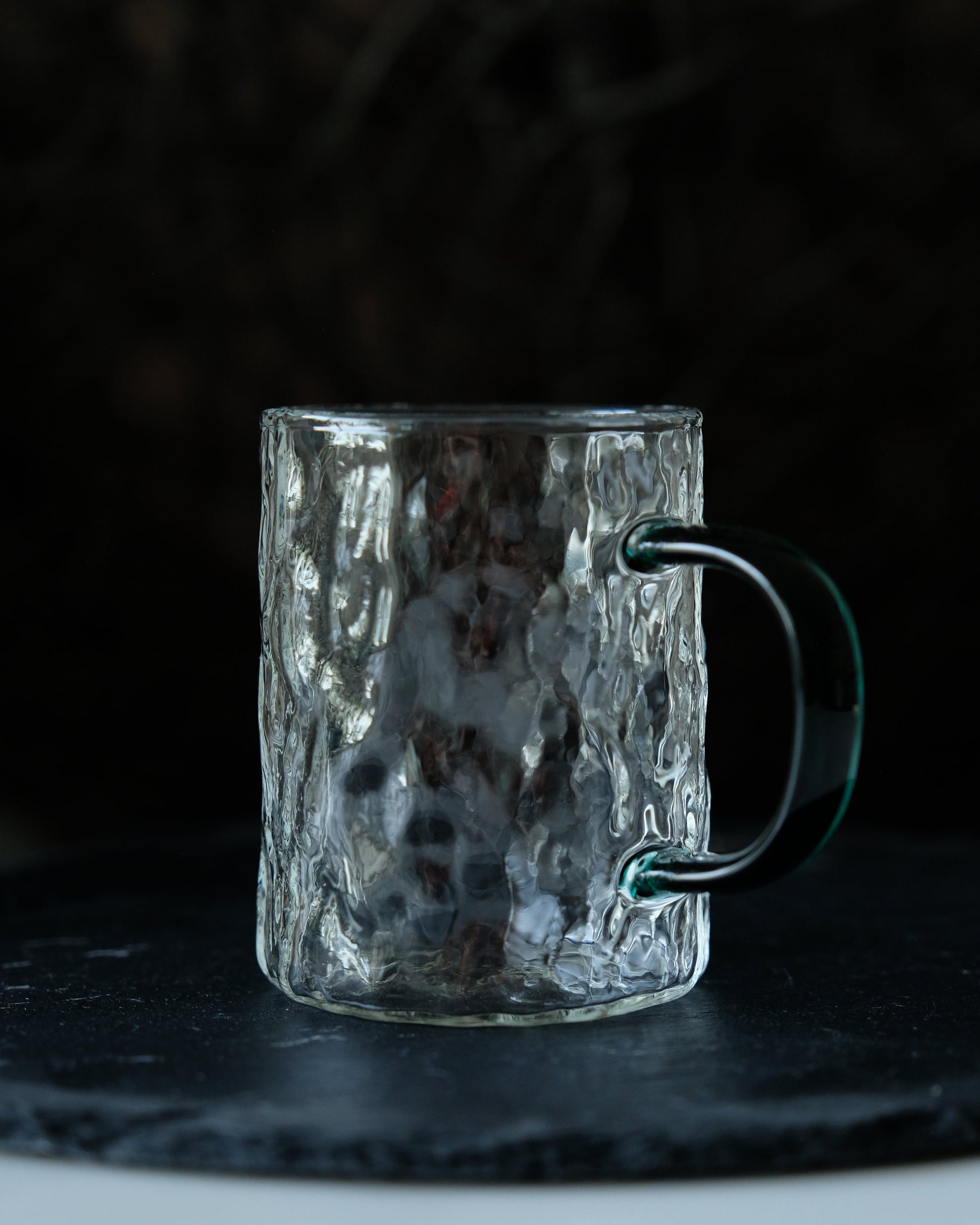 Enjoy your favourite beverages in style with this textured glass mug. It features a unique textured surface that adds visual interest, complemented by a dark green handle for a touch of colour and contrast. Perfect for cozy mornings or relaxing afternoons.